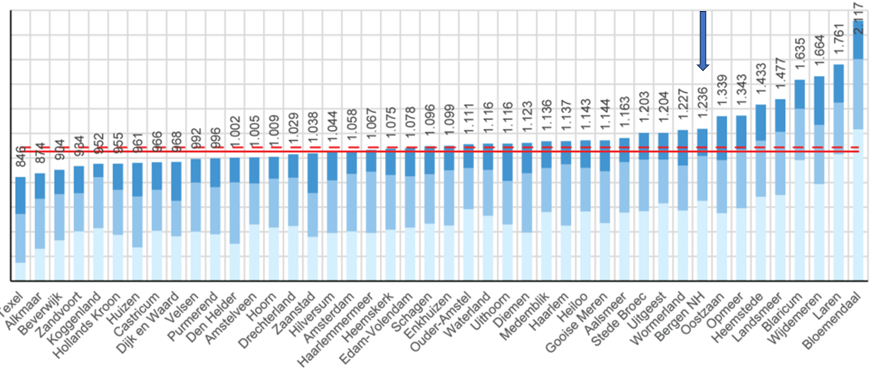 In de ‘benchmark woonlasten Noord-Holland 2025’ zijn 44 gemeenten betrokken. De gemeente op plaats 1 kent met € 846 de laagste gemiddelde woonlasten en de gemeente op plaats 44 de hoogste met € 2.117. De gemiddelde woonlasten in Noord-Holland bedragen € 1.086, het landelijke gemiddelde bedraagt € 1.053.